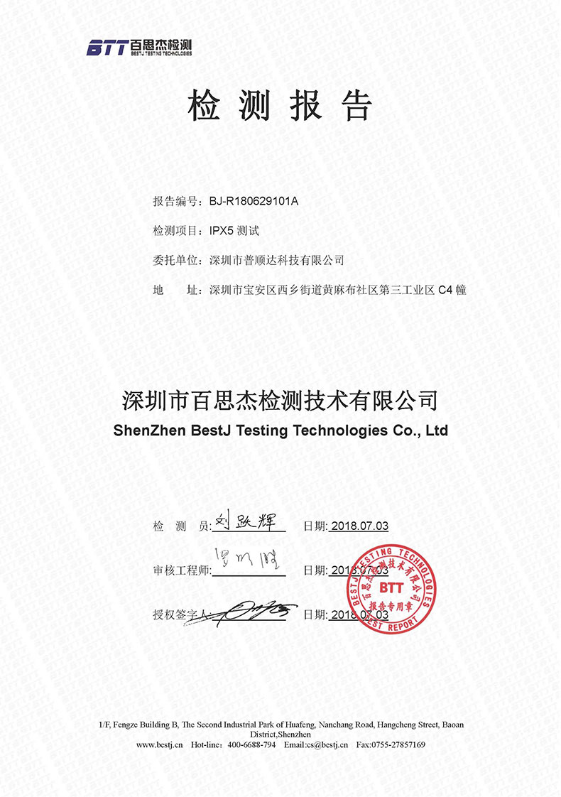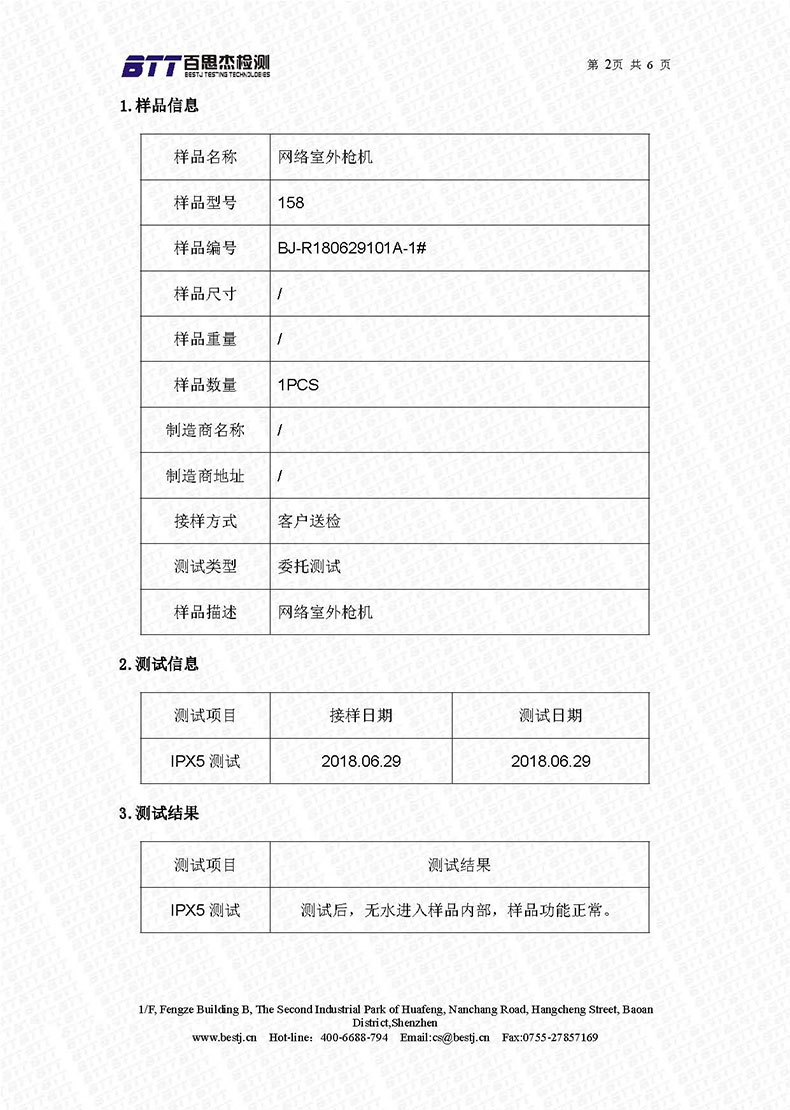 2018年7月,普順達(dá)的158型號(hào)室外槍機(jī),通過IPX5測(cè)試,該款攝像機(jī)具有室外防水功能,下面是檢測(cè)報(bào)告。